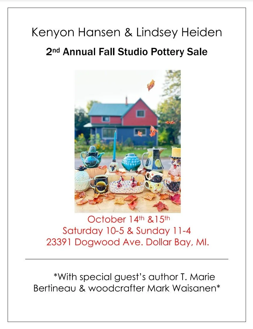 Studio potter Kenyon Hansen and visual artist Lindsey Heiden are all set to host their 2nd Annual Fall Pottery Sale. They will be joined by local artists T. Marie Bertineau, an author, and Mark Waisanen, a wood crafter.