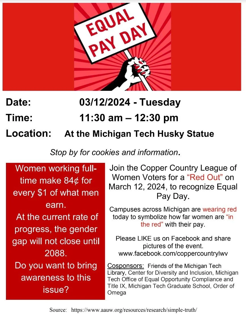 The League of Women Voters of the Copper Country is hosting an Equal Pay Day event at Michigan Tech on Tuesday, March 12 from 11:30 a.m. to 12:30 p.m.