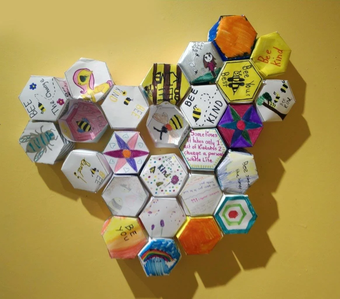“Being that we’re beekeepers at Houghton Elementary, and we’ve often been in awe over the elegant structure of the honeycomb; how the hexagon creates the most efficient use of space…so it naturally fit…” said Melissa Hronkin, art teacher at Houghton Elementary.